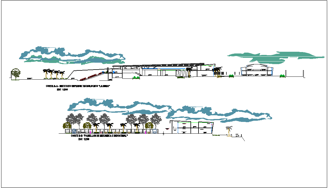 Section with different axis view for technical education building dwg file