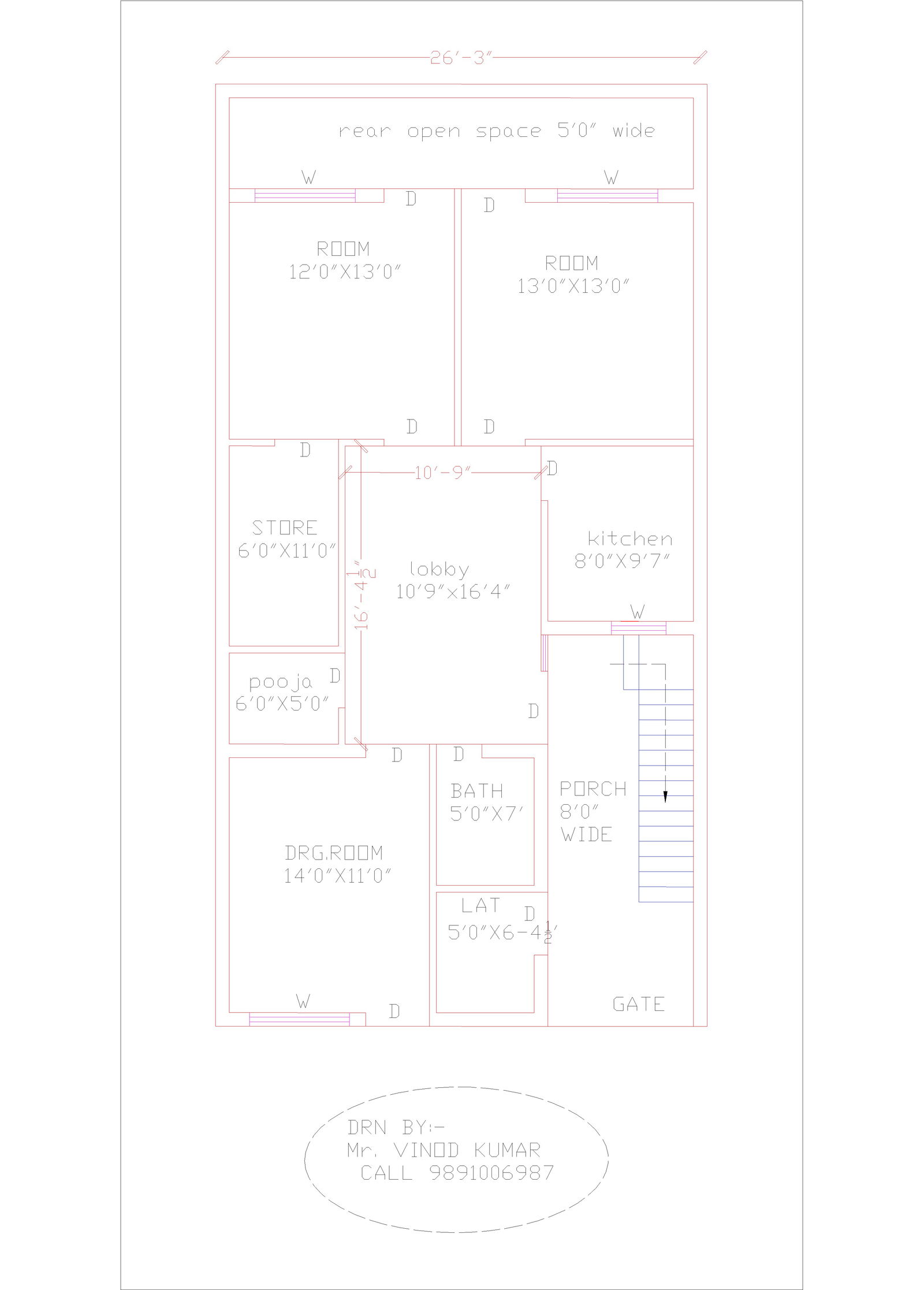 26 feet x 51 feet house design 2 room 1 drawing room 1 kitchen 1 store room 1 pooja room 1 bath room 1 wc