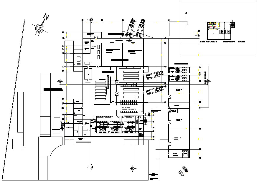 Planning plant process prawns in tumbes plan detail dwg file, including north direction detail, section line detail, centre line detail, car parking detail, etc.