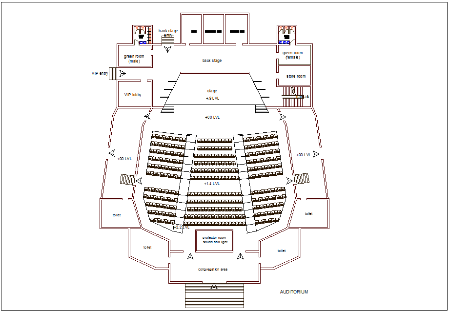 Museum auditorium plan with architectural view dwg file in plan with view of auditorium main area with seating area,male and female washing area,AH and generator room view,stage view,projection