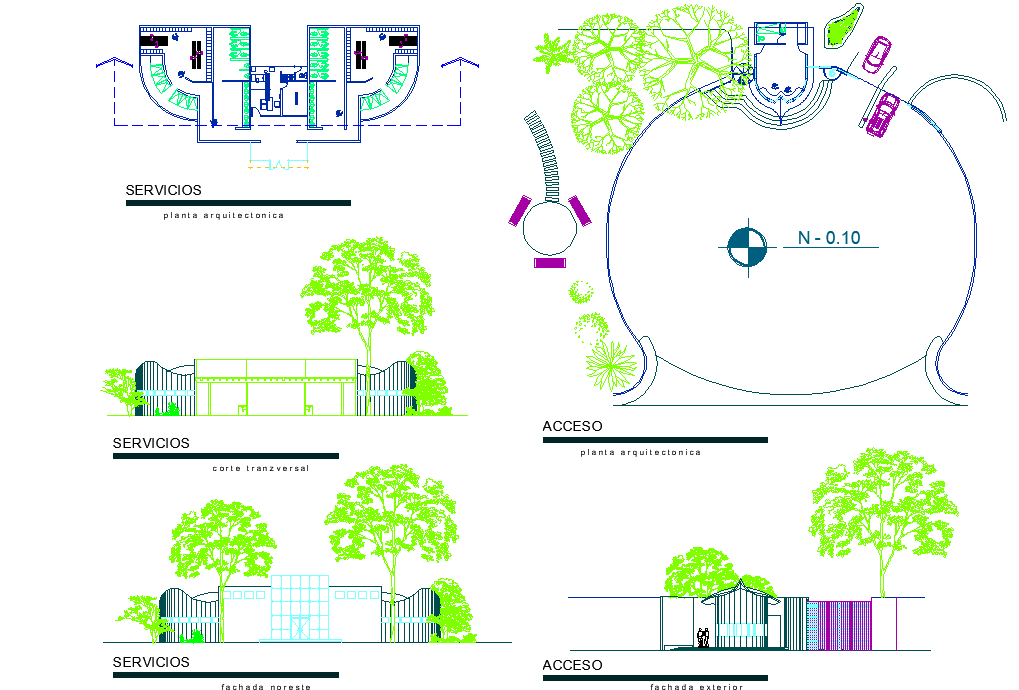 Services room plan detail dwg file, including landscaping detail in tree and plant detail, elevation and section detail, front elevation detail, etc.