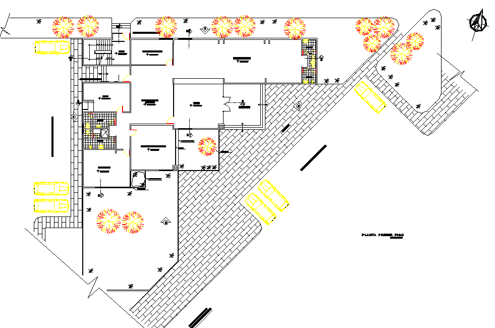 Layout industrial pavilion deposit plan detail dwg file, with north direction detail, landscaping detail in plant and tree detail, section line detail, toilet detail, etc.