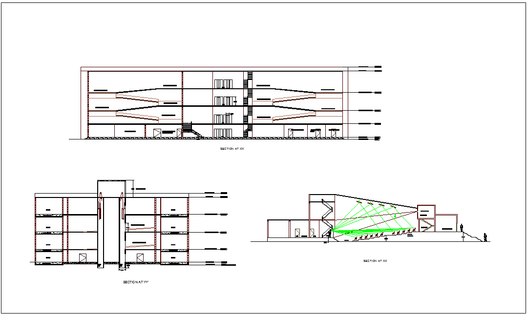 Different axis section view of museum dwg file in section view with wall,floor,floor level,stair and