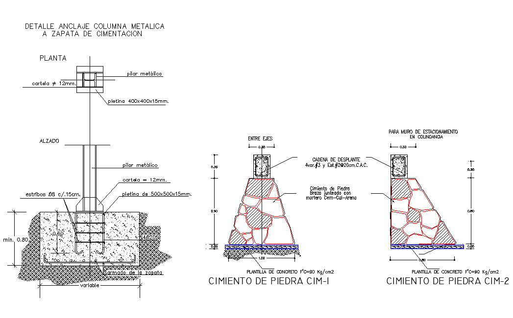 Detail anchor metal column to foundation shoe plan dwg file, with section detail, dimension detail, naming detail, reinforcement detail, bolt nut detail, etc.