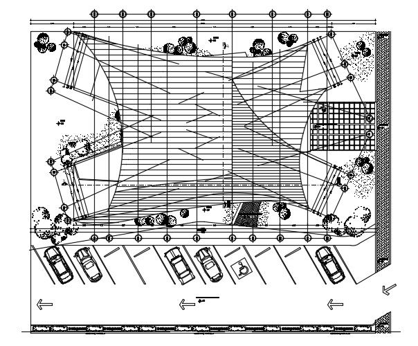 Roof Plan In DWG File with car parking detail, landscaping detail in tree and plant detail, center line plan detail.