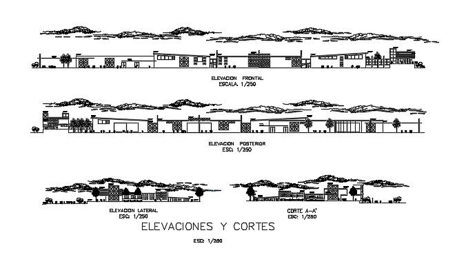 Download Free Factory Plan In DWG File with scale 1:250 detail, front elevation detail, side elevation detail, back elevation detail.