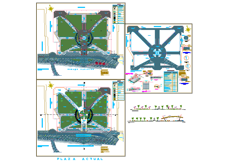 This AutoCAD DWG features a complete urban plaza plan detail, including symmetrical landscape zones, radial pathways, central circulation nodes, and detailed hardscape patterns. The drawing highlights the main plaza’s geometric layout with intersecting pedestrian routes extending from the circular core, along with annotated materials, planting beds, walkway textures, and pathway widths clearly illustrated. Multiple plan views show the existing plaza condition and redesigned layout, providing designers with accurate references for landscape zoning, pavement distribution, and the placement of amenities. Elevation strips at the bottom represent vegetation lines, canopy profiles, structural elements, and walkway curvature for better visualization during construction planning.