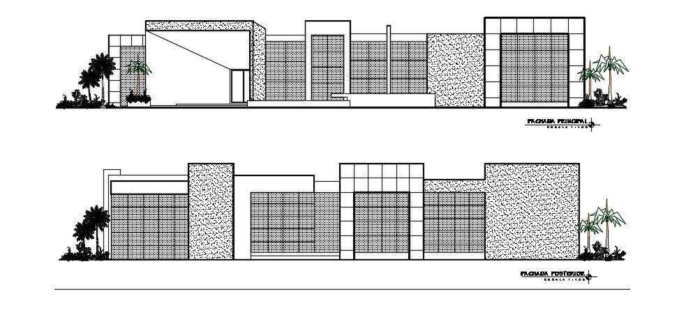Modern Office Building Elevations In DWG File which includes building front elevation, back elevation.