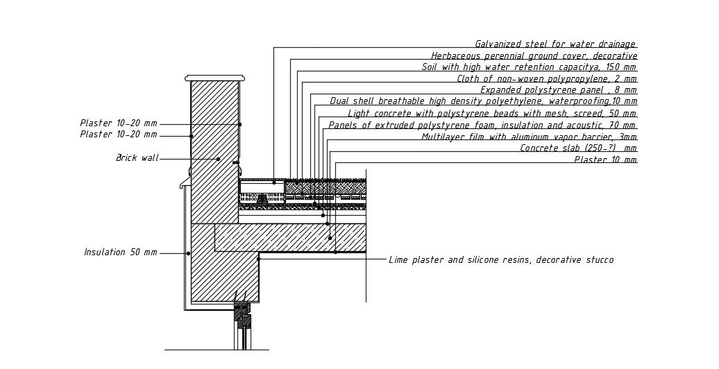 Wall Section In DWG File which includes Galvanized steel for water drainage, Lime plaster and silicone resins, decorative stucco, Concrete slab, plaster.