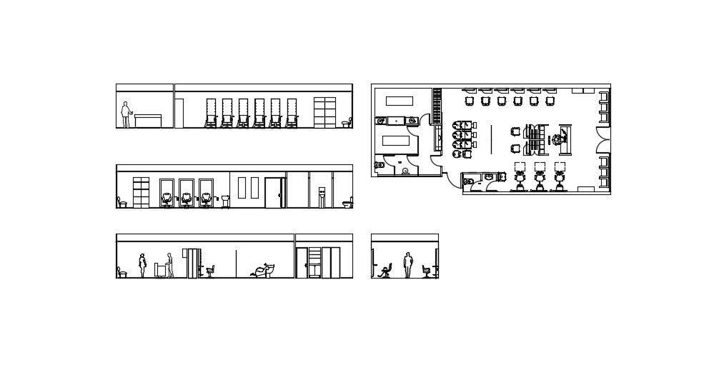 Salon Plan In DWG File which includes a reception area, waiting room, different section of hair salon department.