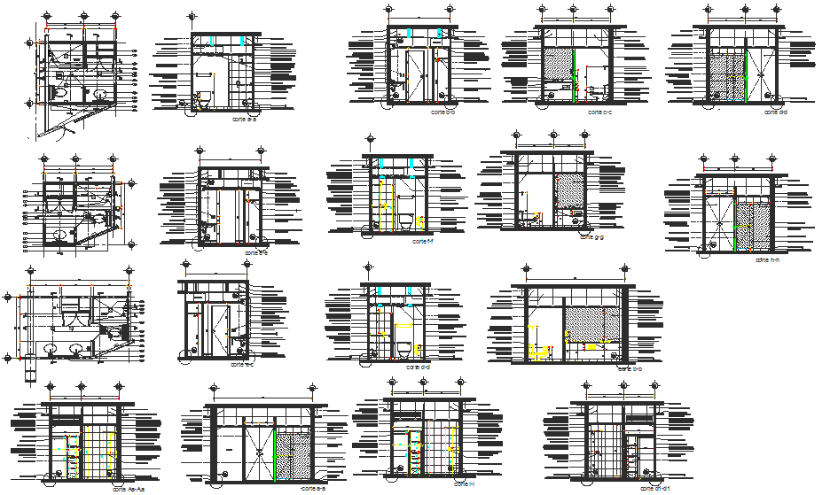 This Hotel Bathroom design DWG provides a detailed collection of architectural bathroom sections used in hotel projects. Each drawing displays the placement of sanitary fixtures including WC, washbasin, shower enclosure, and accessory points with clear measurement indicators. Wall treatments such as tile layouts, mirror lines, material patterns, and plumbing routing are represented with accuracy to support construction and interior finishing work. The sections also show floor slopes, drainage alignment, service shafts, and ventilation openings designed to meet functional and hygienic standards in hotel bathrooms. These drawings ensure proper coordination between plumbing, civil work, and interior design teams.