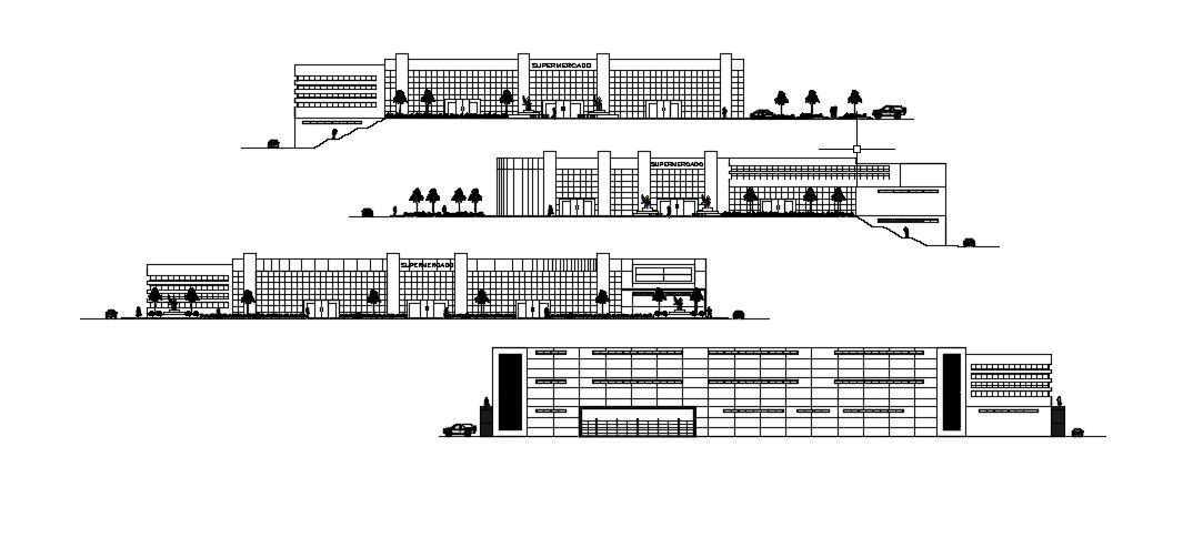 Shopping Mall Elevation In DWG File which shows different types of elevations of the building.