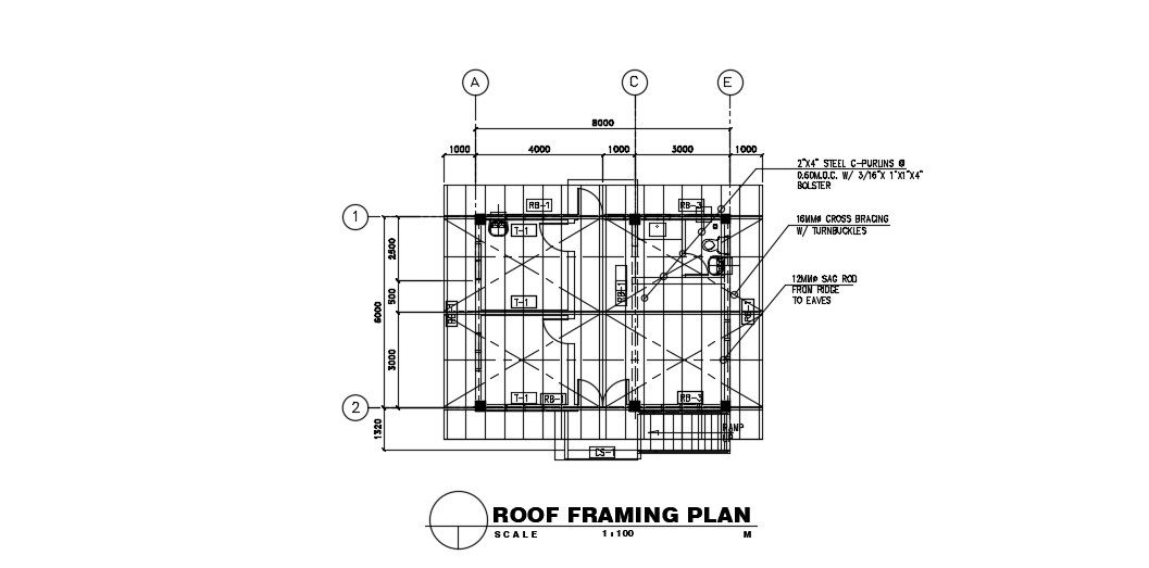 Roof Framing Plan In AutoCAD File which shows from the ridge to eaves cross bracing turnbuckles, steel c-purlins bolster.