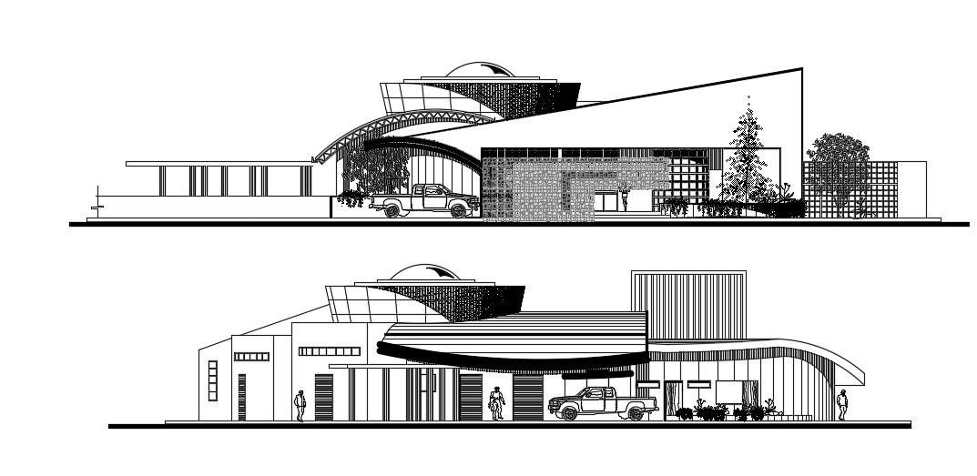 Download Free Factory Elevation Design In DWG File which shows front and back elevations of a factory. It also includes details of doors, windows, parking area, garden.