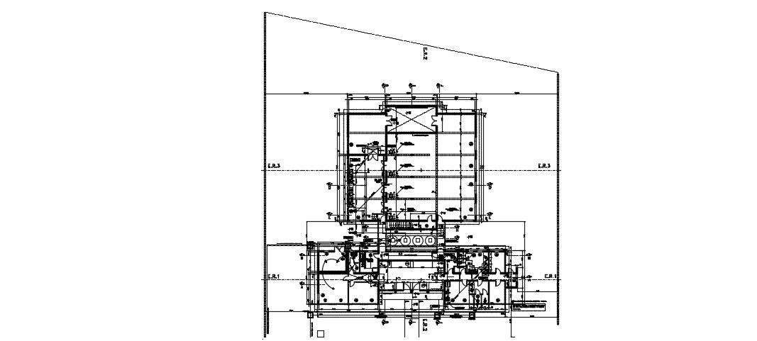 Small Commercial Building Design Plan In AutoCAD File which includes different offices, passage, elevators, stairs details, storage with dimensions.