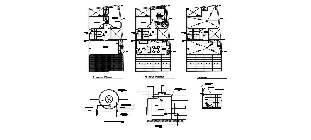 Rooftop Plan In DWG File which includes tank detail, terrace plan, 4th-floor plan of the apartment which has room, bedroom, kitchen, living room.