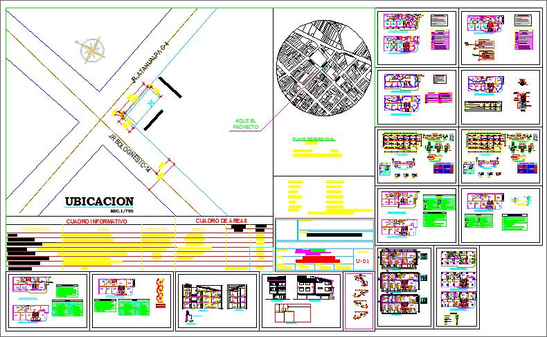 This AutoCAD DWG file provides a complete Clinic Centre Detail Plan, showing the full site location, plot position, and surrounding road network. The drawing includes a detailed Ubicación plan at scale 1:750, marking the clinic’s placement at road intersections and showing the nearby urban layout. A circular locality map highlights the clinic’s position within the city grid for better orientation. The sheet also contains a comprehensive information chart and area chart, listing room types, surface areas, and functional divisions used in clinic design and planning.