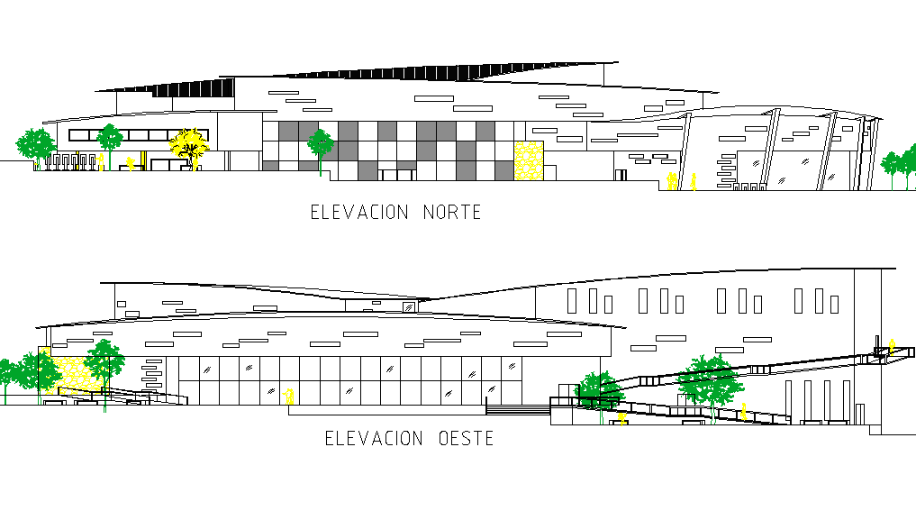 Elevation project plenary plan detail dwg file, with landscaping detail in tree and plant detail, front elevation detail, side elevation detail, etc.