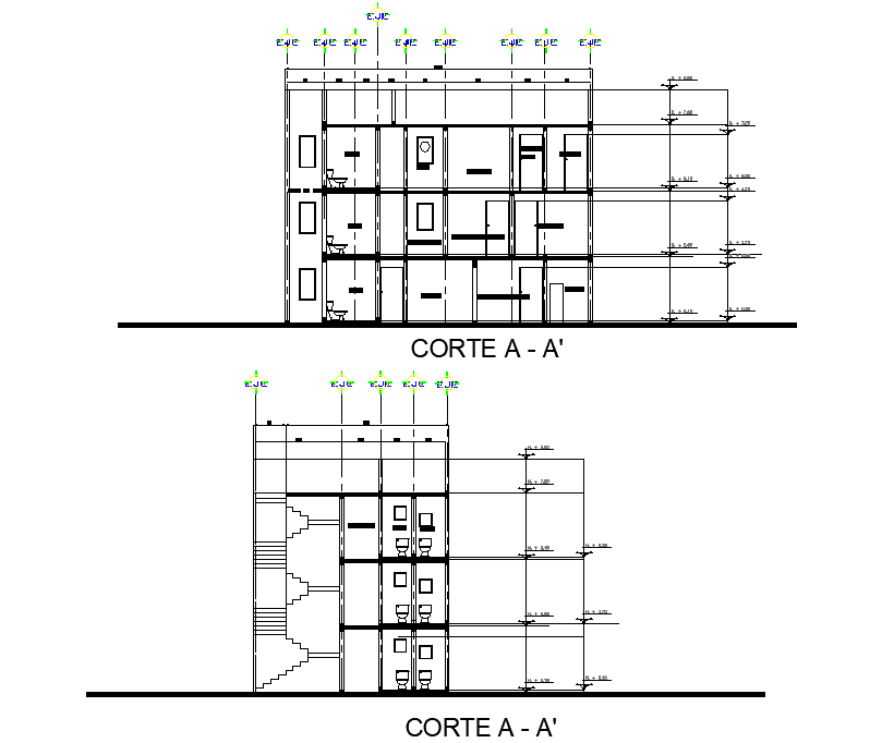 Section Building of three levels plan detail dwg file, with section A-A’ detail, section B-B’ detail, leveling detail, dimension detail, naming detail, etc.