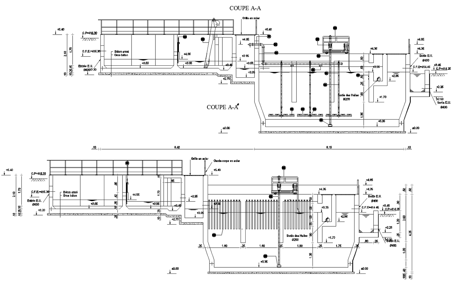Pre-treatment equipment plan. Plan with detailed sections and dimension detail.