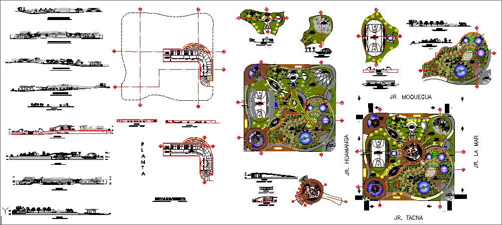 This architectural drawing presents a complete urban theme park layout, featuring multiple landscaped zones, pedestrian pathways, recreational courts, and water bodies arranged within an organized site structure. The plan includes circular plazas, curved movement paths, gathering gardens, and distributed vegetation clusters placed across different park modules. Several courts and activity platforms are shown, connected by shaded walkways and bordered by layered planting beds. The main plan is surrounded by access routes such as JR Moquegua, JR Huamanga, JR La Mar, and JR Tacna, clearly defining the park’s boundary and orientation. Each park block includes dynamic compositions of fountains, ponds, seating areas, pavilions, and open lawns, represented through detailed landscape symbols.