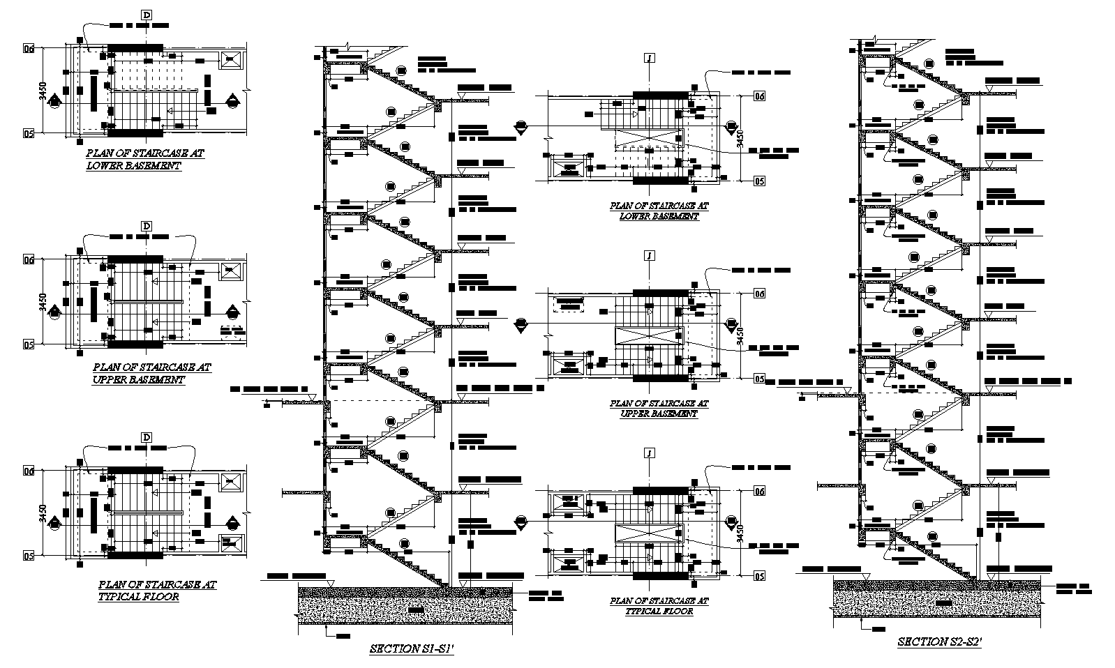 Staircase detail plan. Plan of staircase ar lower basement, upper basement, typical basement with detailed sections.