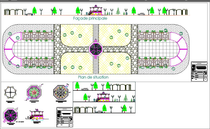 The elevation sheets show the façade principale, including pergolas, lamp posts, trees, and the detailed pavilion structure with columns, railings, and roof profiles. Additional sections illustrate side views of the pergolas, benches, playground boundaries, and decorative garden elements, helping visualize the height relationships and architectural characteristics on the site. Smaller drawings depict the pavilion from multiple angles, demonstrating its geometric arrangement and material indication lines. This layout offers a complete representation of a well-organized outdoor children’s play environment, integrating recreational zones, landscaped paths, architectural components, and clear visual orientation.