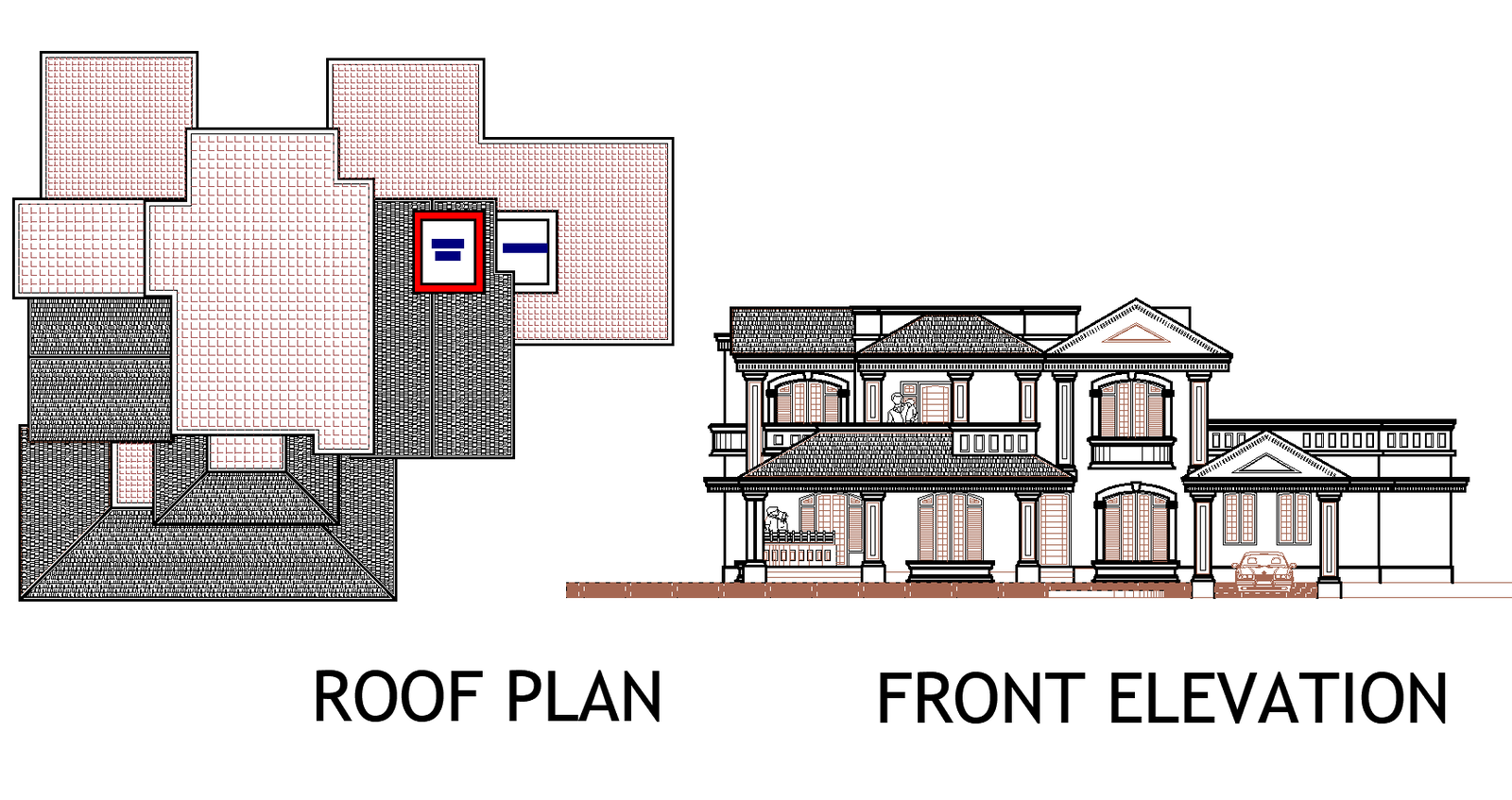 Plan of a bungalow. Roof plan or top plan with front elevation with dimension detail.