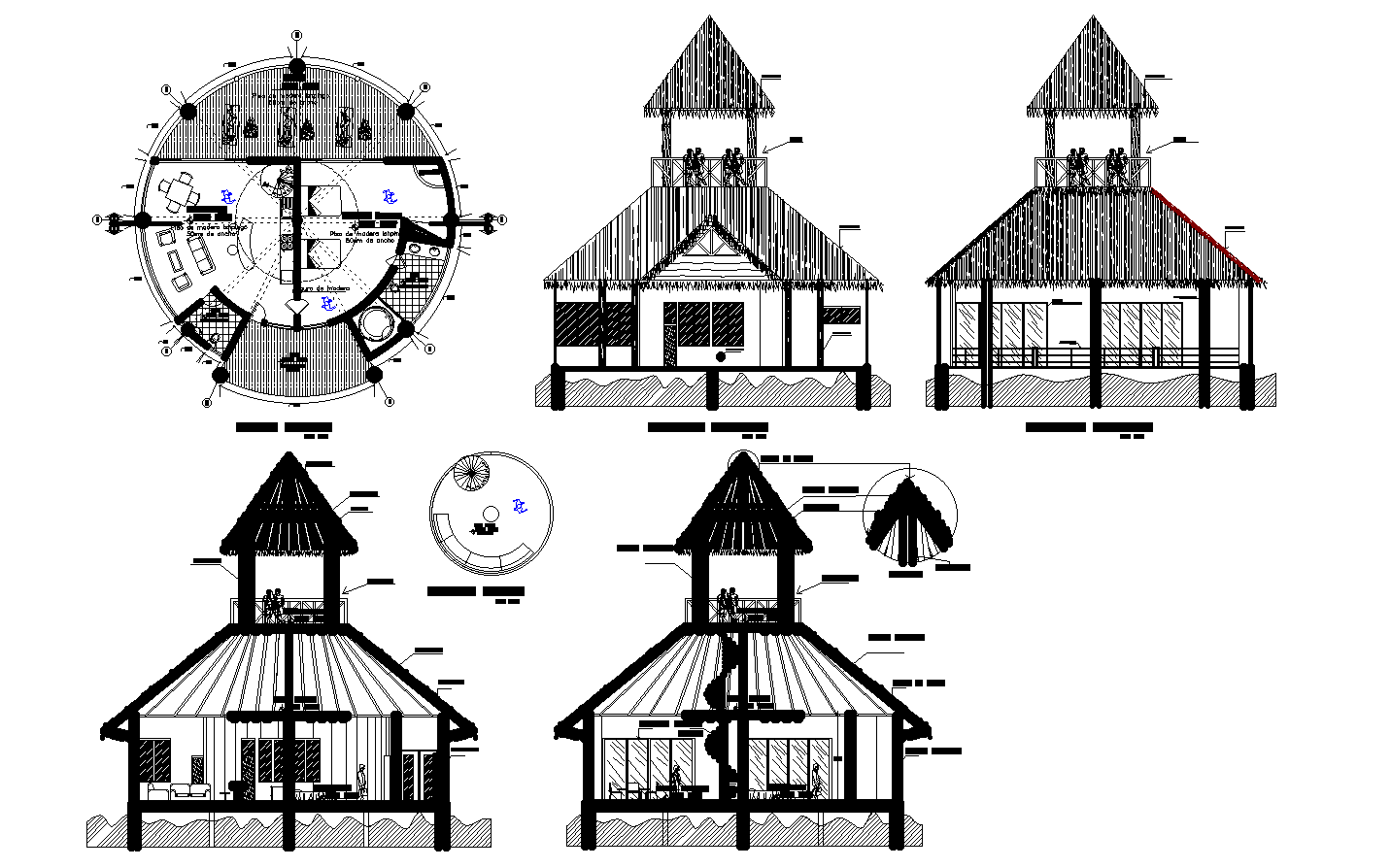 Elevation of ecological resort plan. Details of the elevation are shown near to it. Each section is planned with detailed dimensions.