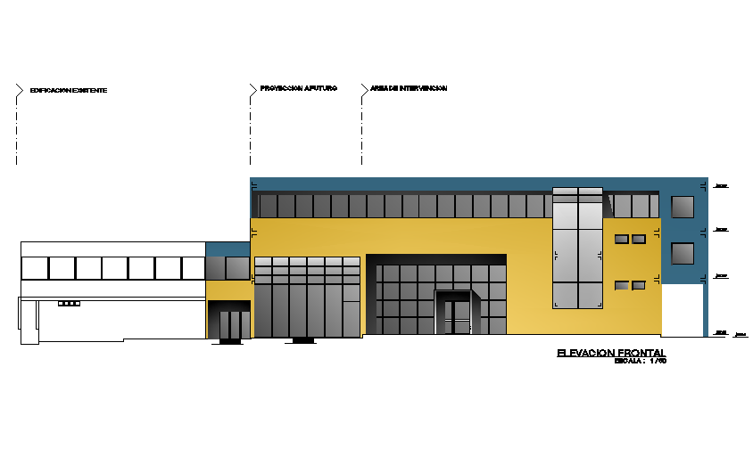 Front elevation house plan detail dwg file, with leveling detail, scale 1:50 detail, furniture detail in door and window detail, etc.