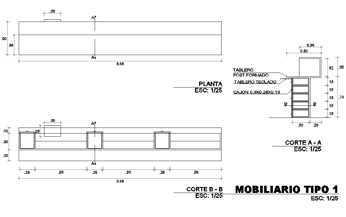 Table plan and section detail dwg file, with scale 1:25 detail, dimension detail, naming detail, etc.