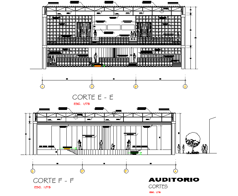 Section Office building auditorium conf room bar restaurant plan detail dwg file, with centre lien plan detail, section E-E’ detail, section F-F’ detail, dimension detail, etc.