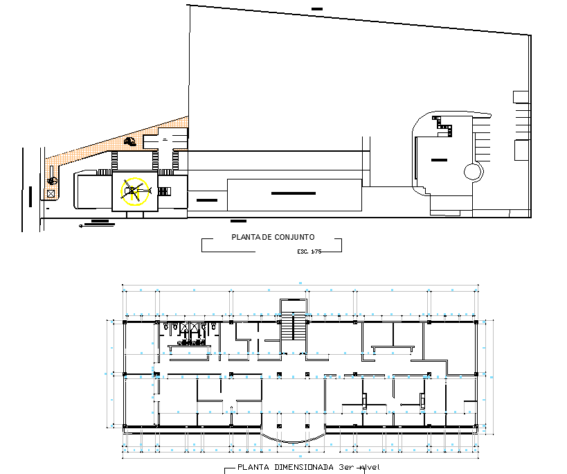 Institutional building with heliport plan detail dwg file, with dimension detail, naming detail, scale 1:75 detail, etc.
