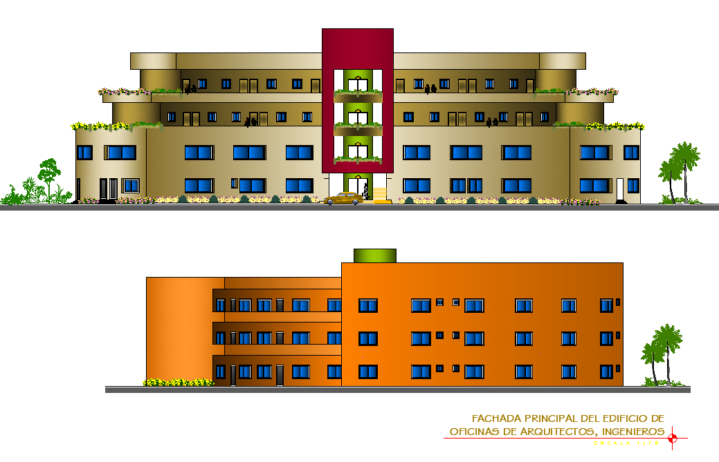 Elevation building multi plan detail dwg file, with front elevation detail, side elevation plan detail, landscaping detail in tree and plant detail, etc.
