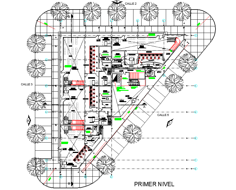 Banking center plan detail dwg file, with centre lien plan detail, dimension detail, landscaping detail in tree and plant detail, naming detail, etc.