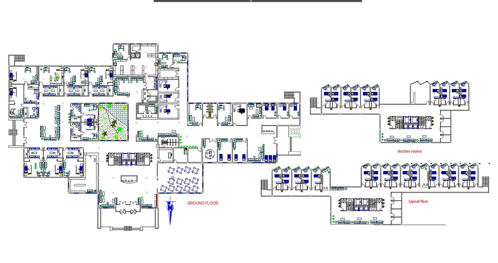 General hospital plan. The top view layout with detailing of furniture, dimension, etc., Detailing of doctors cabin room, reception area, waiting area, wash area, operation room, resting room, conference room, etc.,