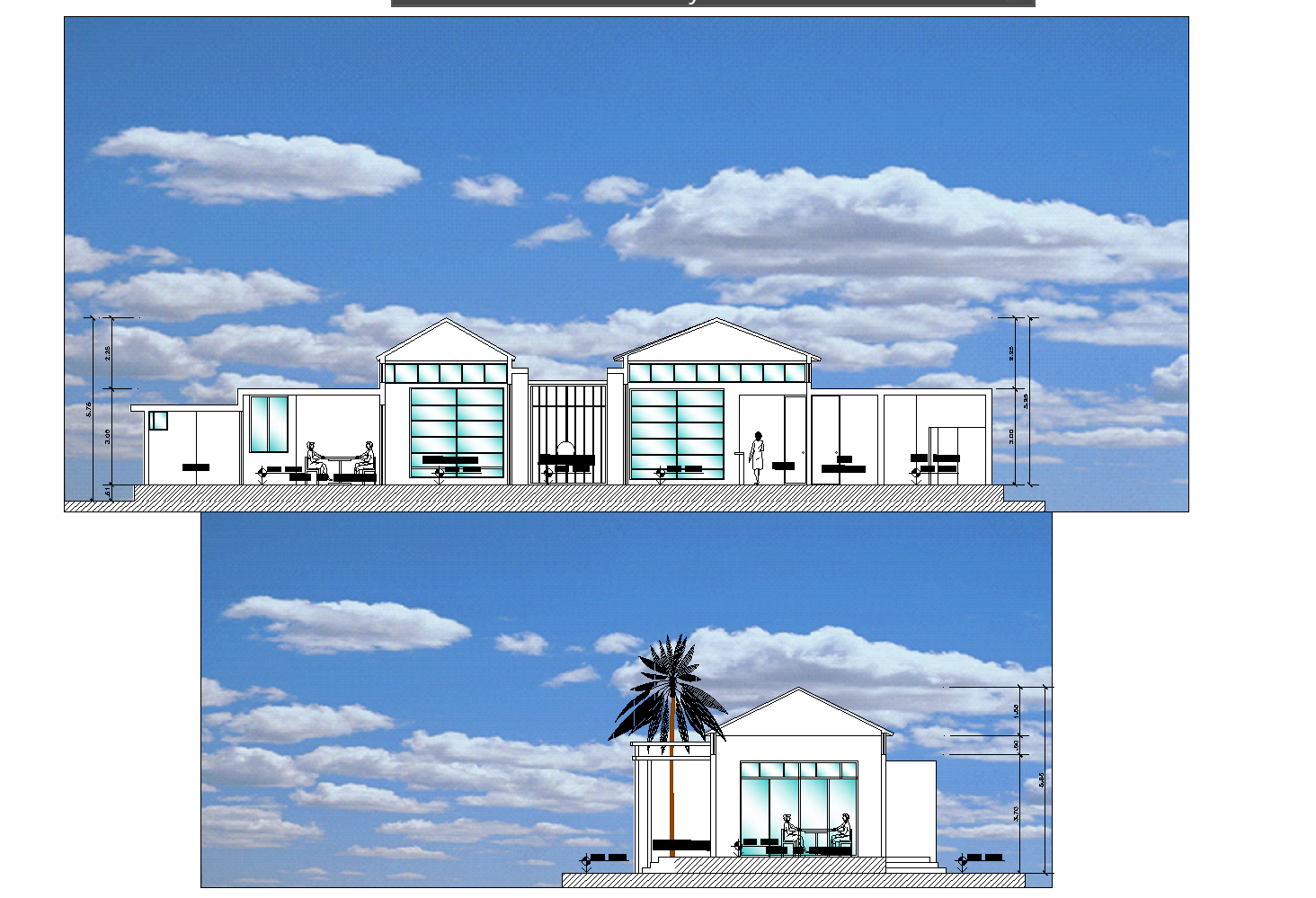City offices and cultural plan elevation. The front elevation and side elevation with door and window detailing, dimension detailing, etc.,