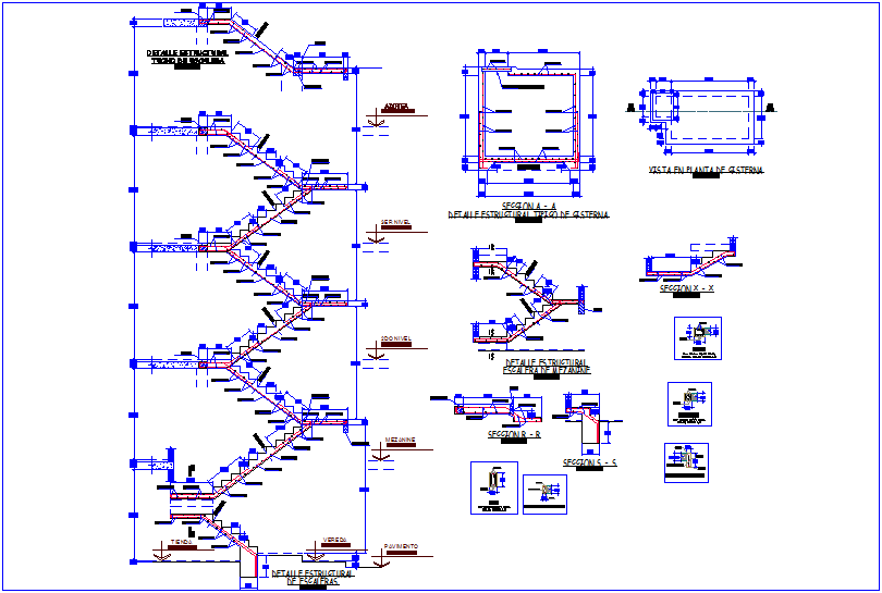 Stair elevation with floor and detail of construction view dwg file