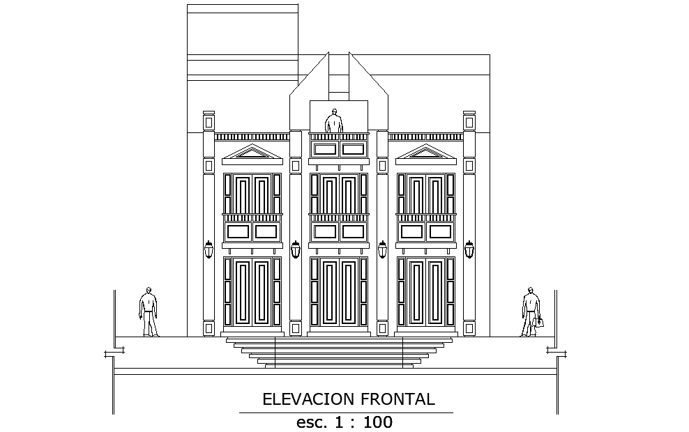 Front elevation building detail dwg file, with column design detail, scale 1:100 detail, etc.