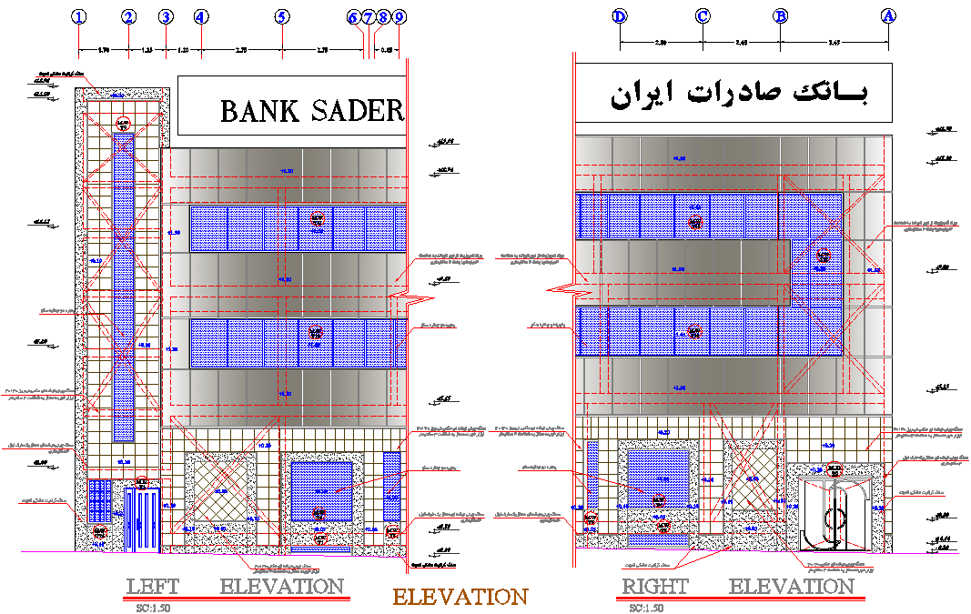 Elevation bank detail dwg file, with left elevation detail, right elevation detail, dimension detail, naming detail, etc.