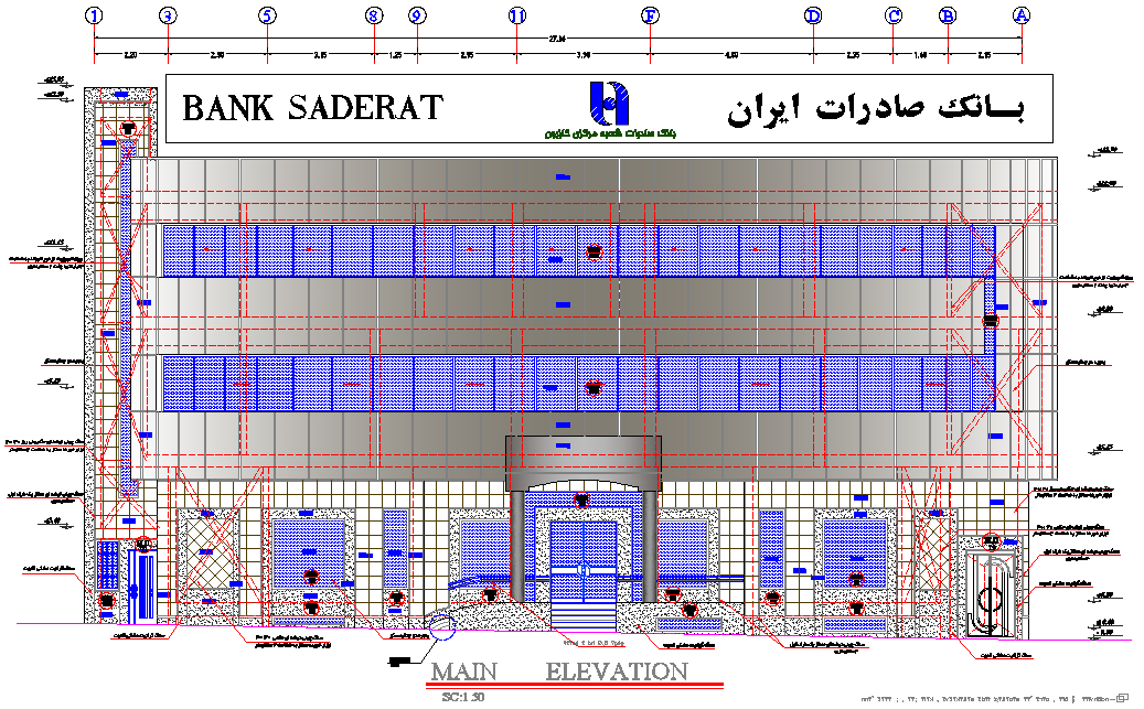 Main elevation plan detail dwg file, including centre line plan detail, dimension detail, naming detail, etc.