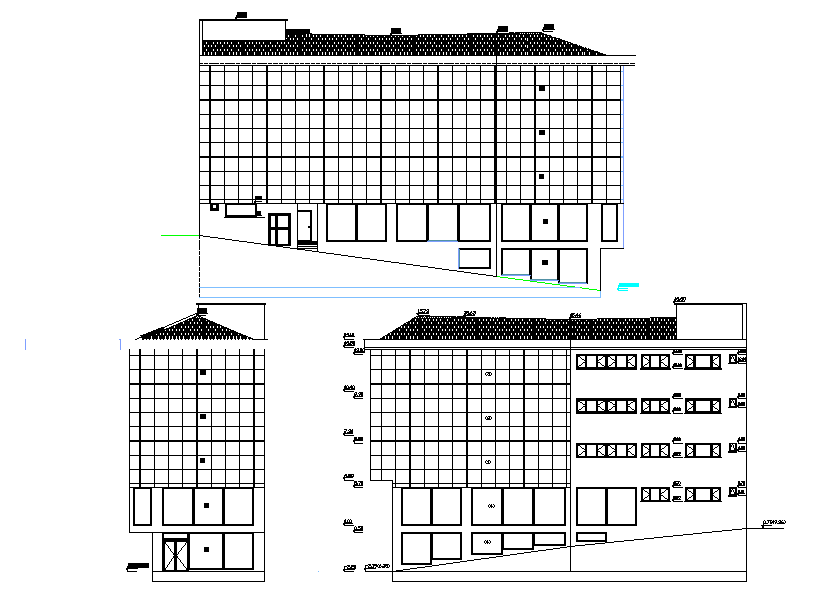 Elevation building offices plan detail dwg file, with front elevation detail, side elevation detail, back elevation detail, etc.