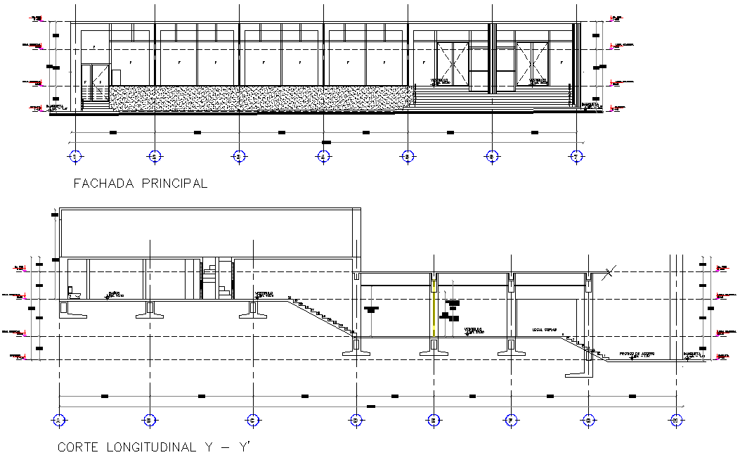Elevation and section house plan detail dwg file, with front elevation detail, section Y-Y’ detail, dimension detail, naming detail, etc.
