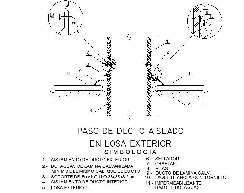 Passage of pipe line isolated on slab exterior detail dwg file, with specification detail, naming detail, etc.