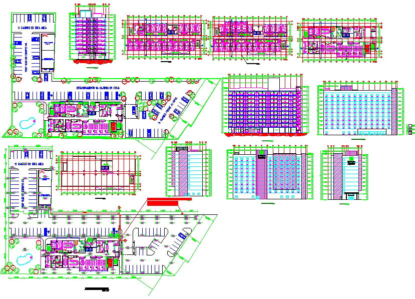 This AutoCAD DWG drawing represents a complete hotel layout designed for picnic or short-stay activities, showing detailed room arrangements, service zones, and circulation planning. The upper section highlights various floor plans with bedroom blocks arranged in grid formats, each displaying beds, wardrobes, internal partitions, and walkway alignment. Dedicated multipurpose halls and large seating spaces are clearly indicated along with column grids and structural supports. The site also includes an organized parking layout with marked parking bays, vehicle entry routes, drop-off areas, landscaped patches, and pedestrian movement zones.