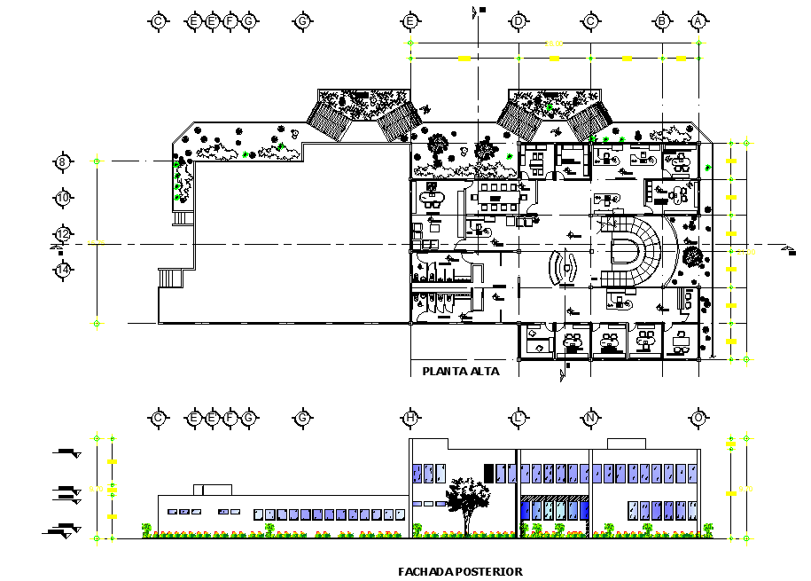 Ground floor plan and elevation administration plan detail dwg file, with centre line plan detail, dimension detail, naming detail, etc.