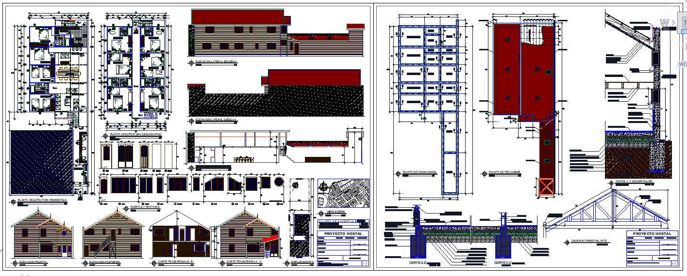 The elevation drawings highlight the external character of the hotel with varied façade treatments, roof slopes, shading elements, and carefully distributed window openings. Additionally, the structural drawings provide foundation details, footing sections, roof truss diagrams, and construction layers that reveal the complete engineering setup behind the hotel project. Cross-sections show floor heights, stair profiles, and vertical connectivity between spaces. Overall, this DWG file offers a comprehensive set of plans suitable for architects, civil engineers, and interior designers working on hospitality projects that require detailed spatial layouts, parking design, restaurant zoning, and structural coordination.