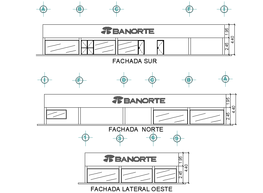 Elevation bank plan detail dwg file, including centre line plan detail, front elevation detail, side elevation detail, etc.