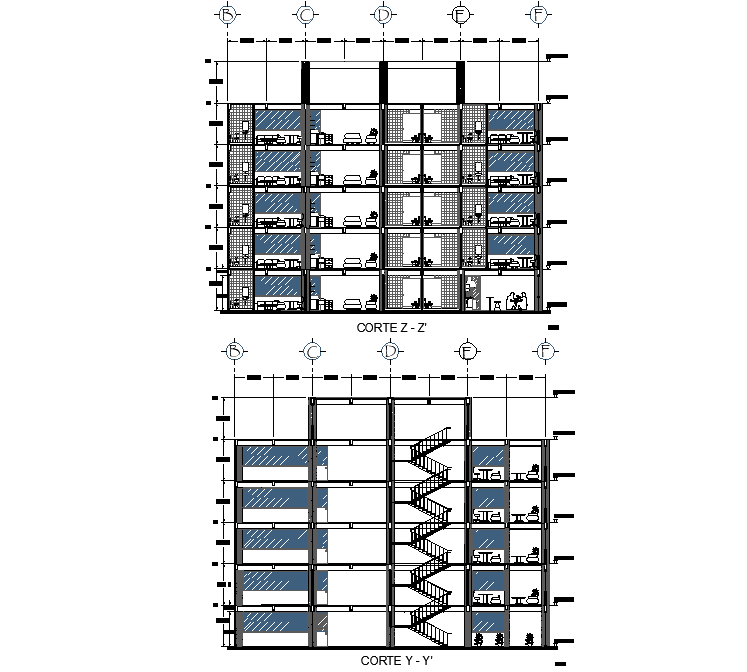 Section office plan detail dwg file, including dimension detail, naming detail, section Y-Y’ detail, section Z-Z’ detail, etc.