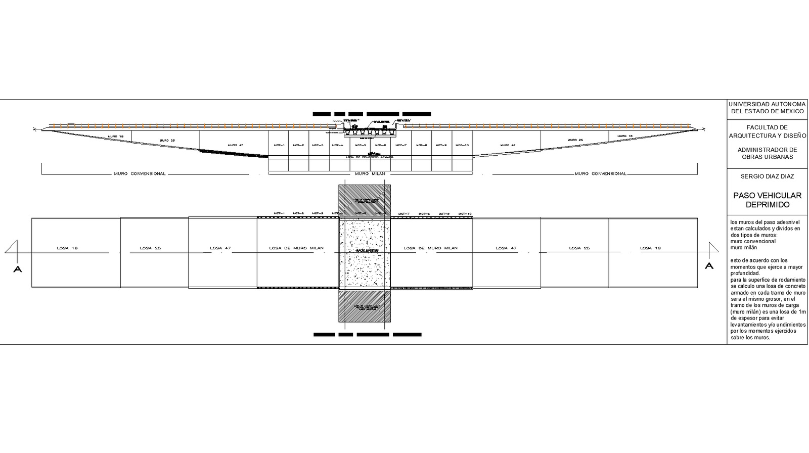 Underpass plan. Detailing of state autonomous university, faculty of architecture and design, administrator of urban works, depressed vehicular passage, etc., is shown in the plan